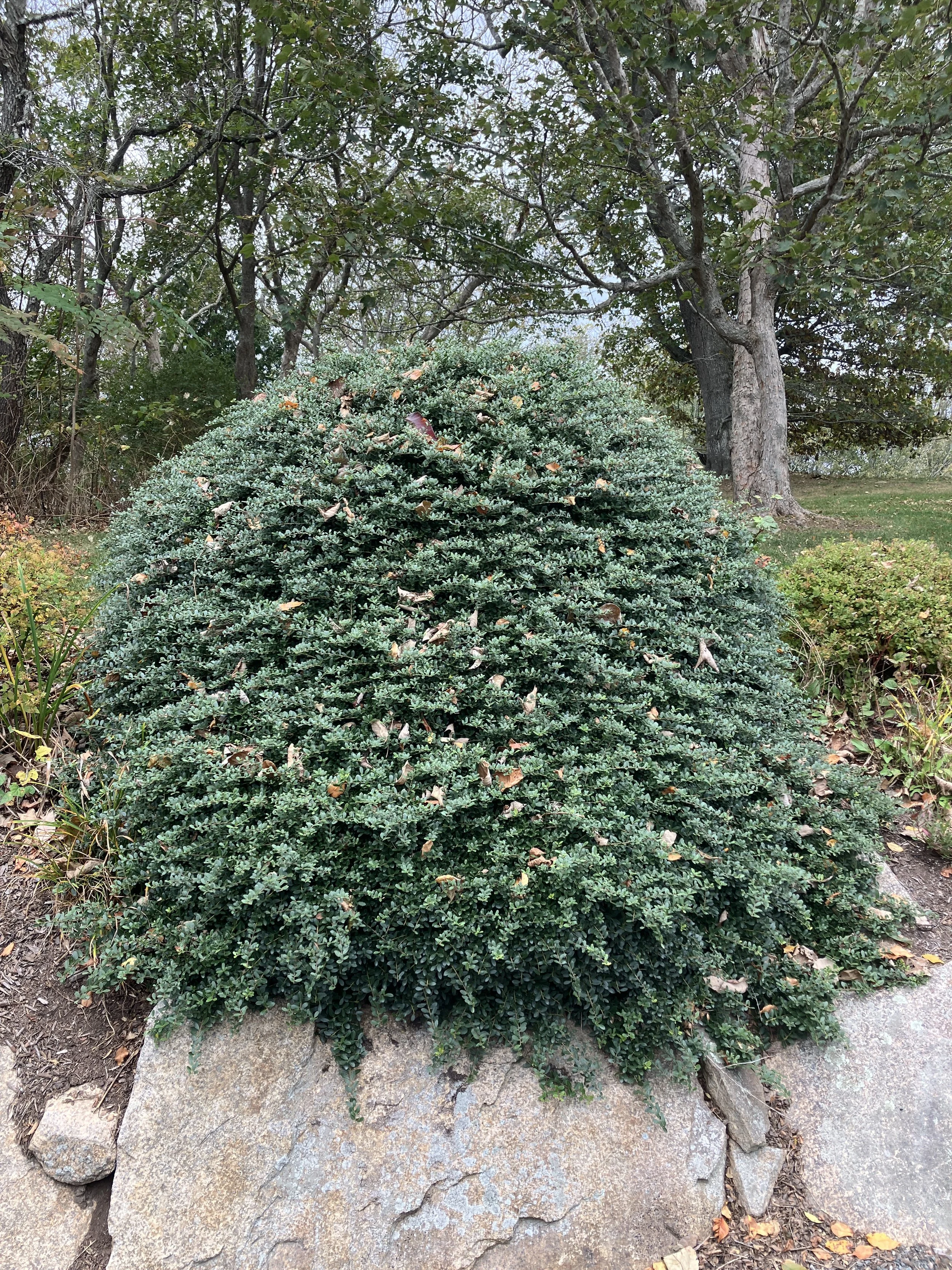 I remember learning Japanese Holly, sometimes called the Japanese boxleaf holly, as a student enrolled at URI. Starting out, I would mistake its identity for boxwood (Buxus sp.) with the leaves being quite similar, but I learned to separate them by the differing bud arrangements. Boxwood is oppositely arranged, and boxleaf holly has leaves held on alternating sides of the stem. Years later when I came to Newport, I would see I. crenata in all kinds of landscape situations, like the narrow ‘Sky pencil’ in a container, or the good doer ‘Hetzii’ as a specimen shrub in dappled shade. Typically described as a small to medium sized evergreen shrub, old plants growing on historic properties throughout Aquidneck Island have achieved tree status, measuring over 20 feet tall and wide. The species is quite prosperous in Newport, and bird planted seedlings can be seen growing in wild areas, including Ballard Park. These relatively harmless invaders are somewhat variable in their characteristics, but are always dense, rounded shrubs with small, dark green leaves. Although termed the Japanese boxleaf holly, the species is native throughout much of eastern Asia, from the Himalayas to the Philippines, north to Siberia. It is in Japan, however, where the plant’s remarkable variability in size and shape is best observed.
